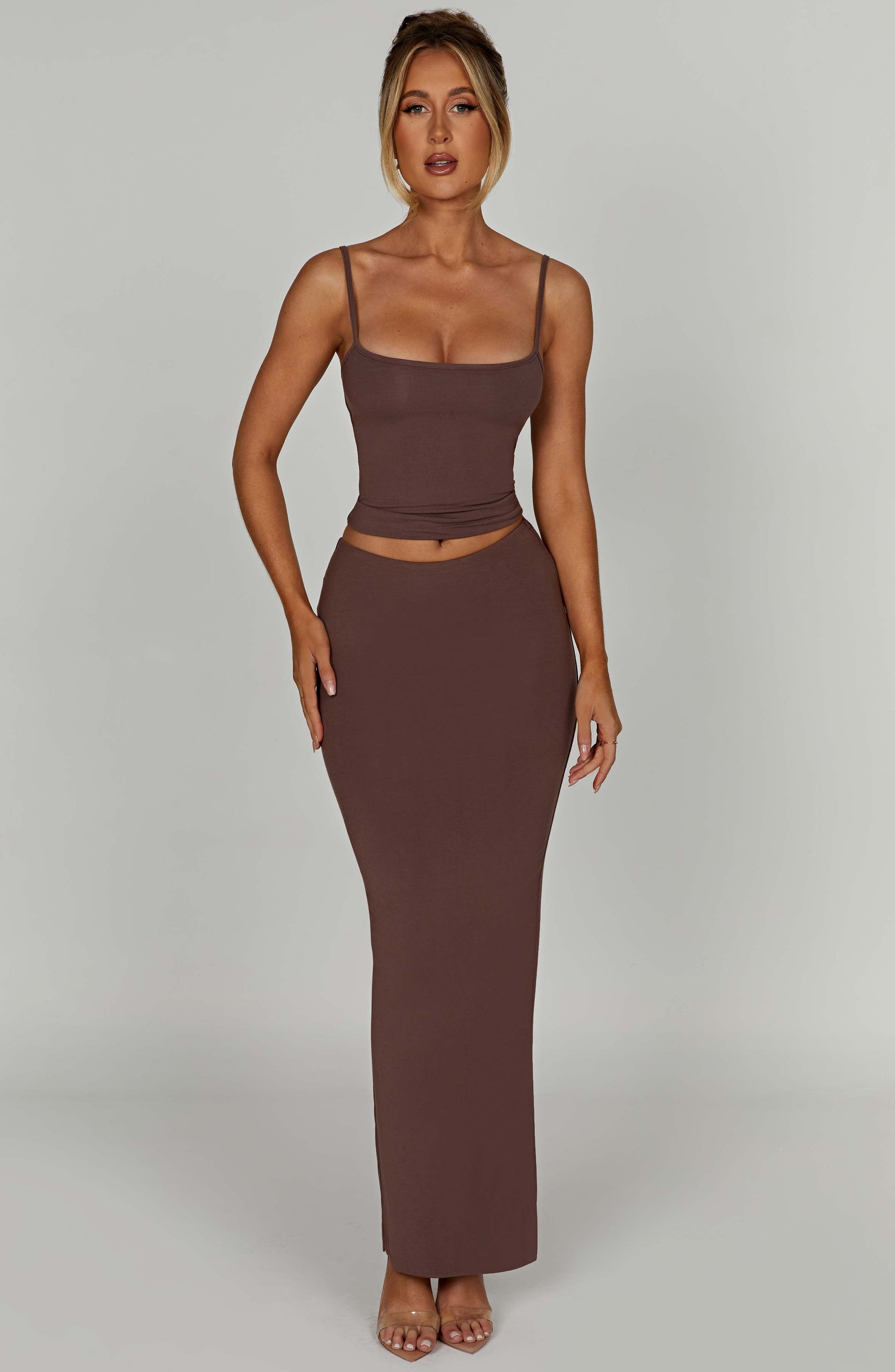 Yumuşacık, ikinci bir cilt hissi veren, iki katmanlı Yasmin maxi etek, tekrar tekrar giymek isteyeceğiniz bir parça. Esneklik sağlayarak vücudunuza şekil verir ve kendini toparlar, bu orta bel basarımı belinizin hemen altında düşerek son derece çekici bir görünüm sunar. Anika crop top ile kombinleyerek hayalinizdeki basit ve şık görünümü elde edin.